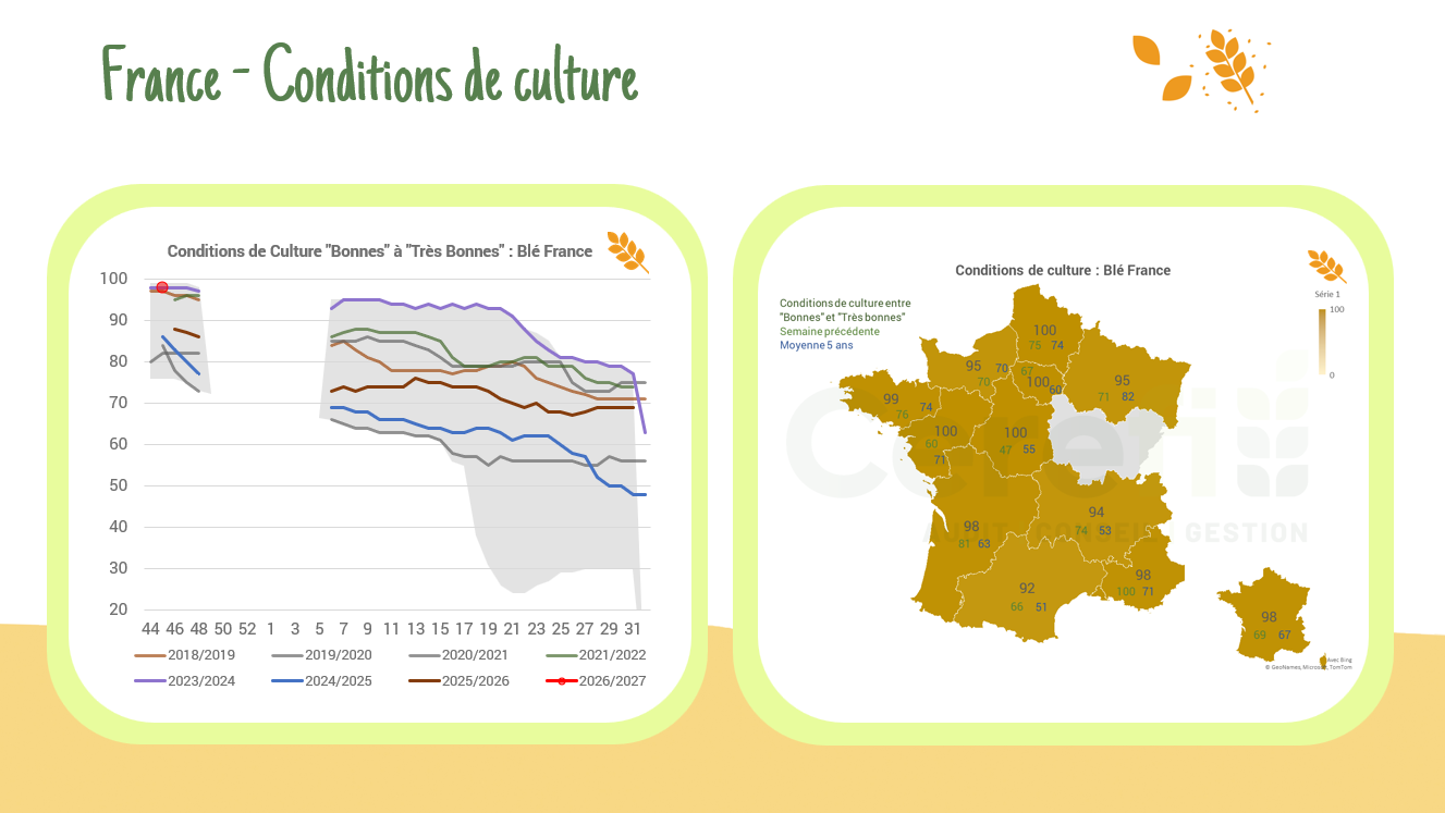 Les semis sont réalisés à 89 %, contre une moyenne quinquennale de 84 %. Les conditions de culture atteignent des niveaux exceptionnellement élevés, avec 98 % des surfaces évaluées entre Bon et Très Bon, à comparer à une moyenne de 67 %.