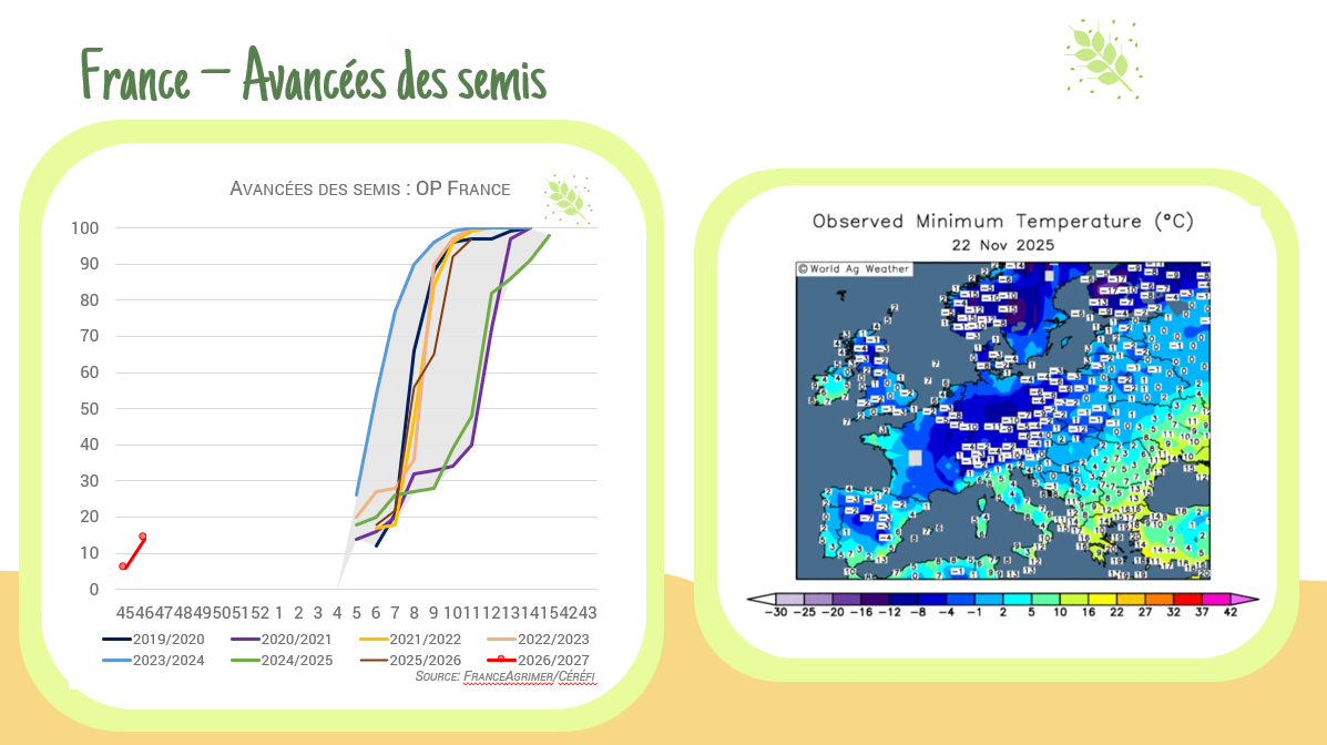 14 % des orges de printemps sont déjà semées, signe d’une certaine confiance vis-à-vis du risque de gel, alors même que les températures sont récemment tombées sous les 10 °C dans plusieurs régions. Si l’hiver s’avérait rigoureux, ces orges pourraient être fortement touchées.