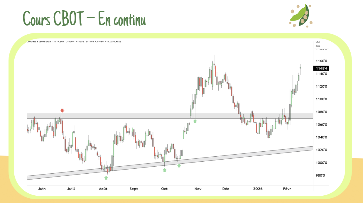 Les cours du soja américain reviennent sur leurs niveaux de mi-novembre, soutenus par les déclarations de Donald Trump évoquant un objectif de 20 MT d’achats chinois sur la campagne en cours, ainsi qu’un accord avec l’Inde portant sur des importations d’huile de soja.