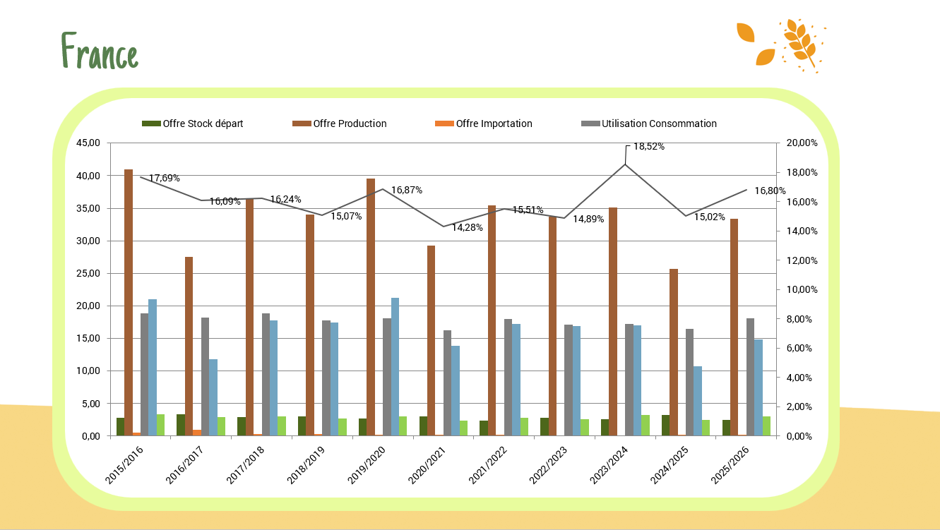 Après un échec sous 195 €/T, le blé a corrigé pour revenir tester le support en place depuis septembre. Mouvement de consolidation technique plus que de retournement. Fondamentaux partagés : disponibilités mer Noire, USDA encore lourd (Argentine), mais demande internationale soutenue qui limite la baisse. Range court terme : 185–195 €/T // Sous le support […]
