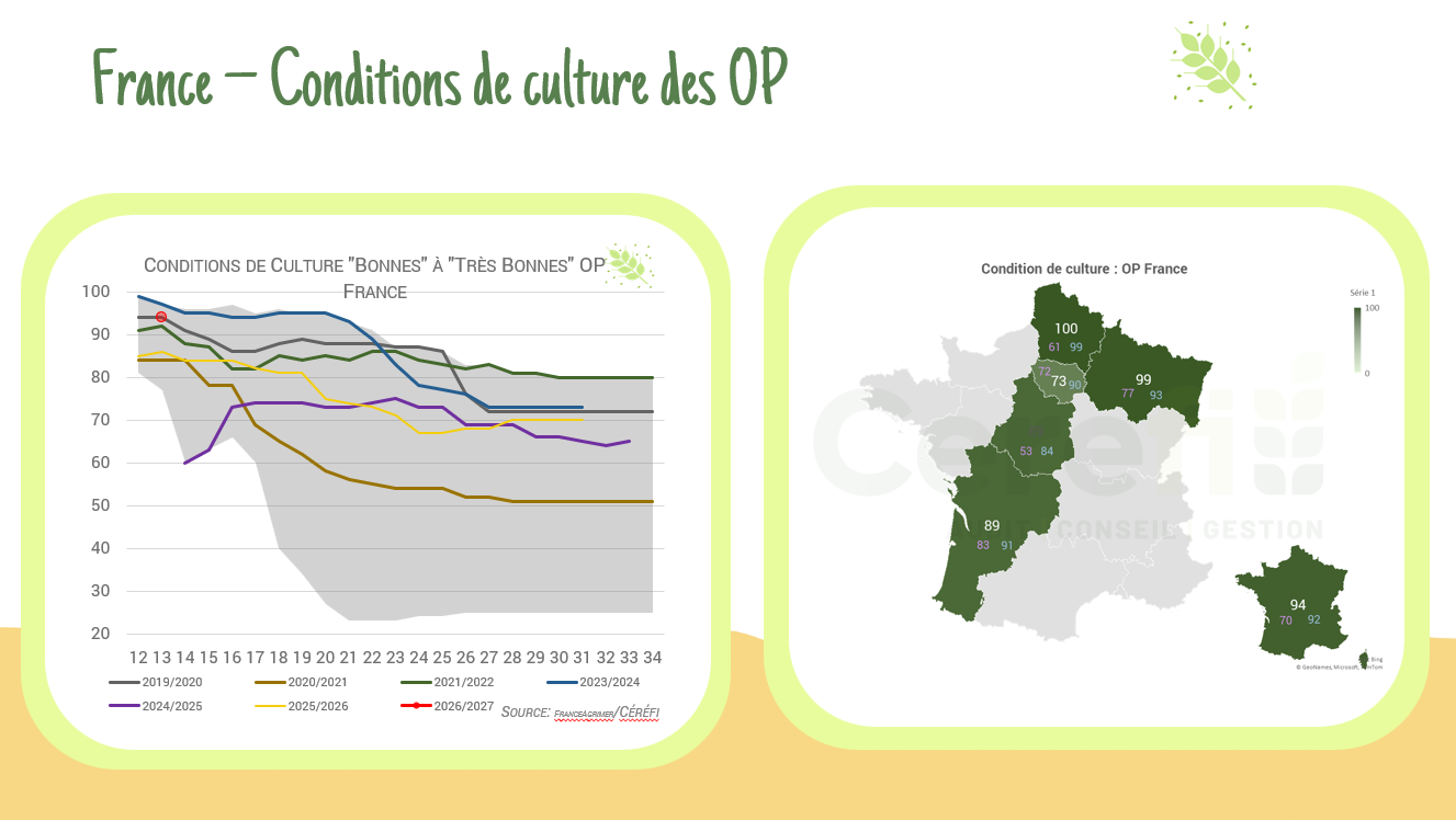 Pour la 6ᵉ semaine consécutive, les conditions de culture restent inchangées en blé et en OH, avec respectivement 84 % et 81 % des surfaces jugées B et TB. En OP, 94 % des surfaces notées B et TB, contre une moyenne quinquennale (M5) de 82 %.