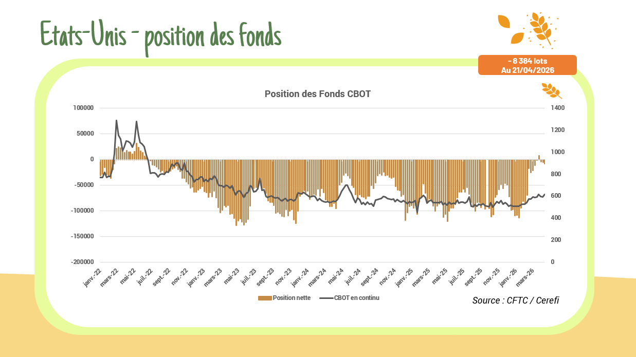 La divergence entre les marchés CBOT et Euronext a tiré les cours Euronext vers le haut. Sur Euronext, le blé échéance septembre 2026 ainsi que le maïs juin 2026 gagnent chacun 2,25 €/T, atteignant respectivement 209 €/T et 206,50 €/T. Les cours rebondissent actuellement sur la moyenne mobile à 50.