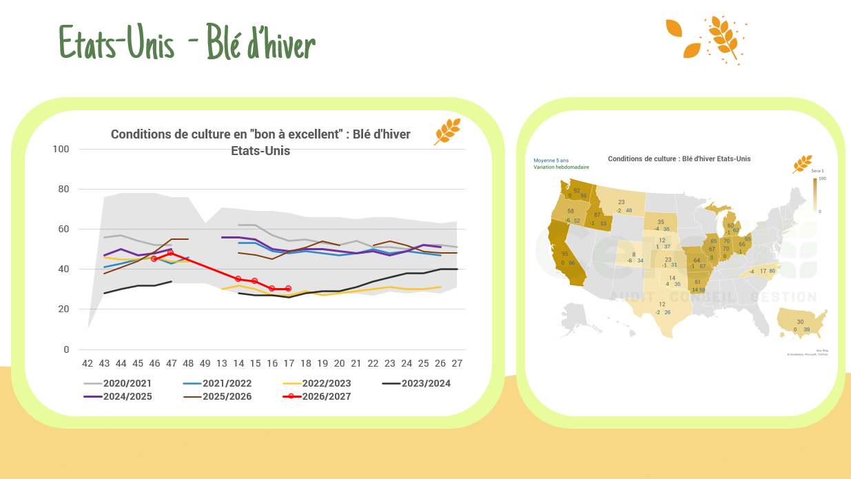 En France, après 7 semaines inchangées pour les conditions de culture en blé et en OH, cette semaine les conditions ont été revues légèrement à la baisse passant de 84% à 83% des surfaces jugées entre B et TB contre toujours 81% en OH.