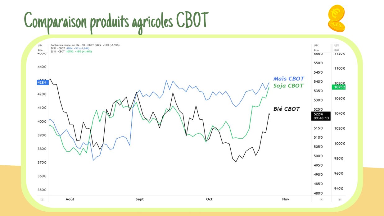 Accord commercial en vue entre les USA et la Chine. Pékin retarderait ses règles sur les terres rares et achèterait du soja américain sur plusieurs années. Trump confirme l’accord sur TruthSocial. Marchés en hausse : Blé +1,9% | Maïs +1,18% | Soja +1.41%