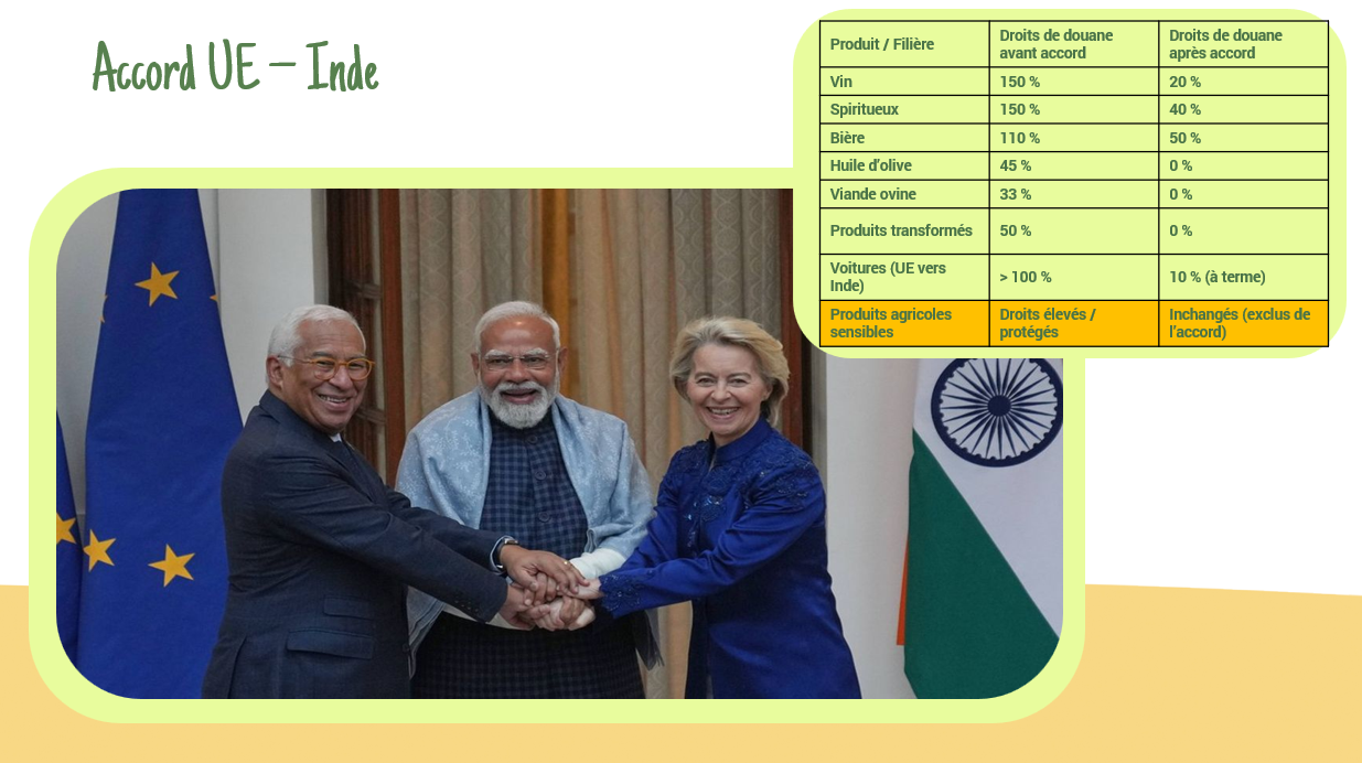 Un accord de libre-échange majeur a été conclu entre l’UE et l’Inde, visant à dynamiser les échanges commerciaux et certains secteurs industriels européens. Cependant, les produits agricoles sensibles sont exclus de l’accord, s’opposant à l’accord du mercosur.