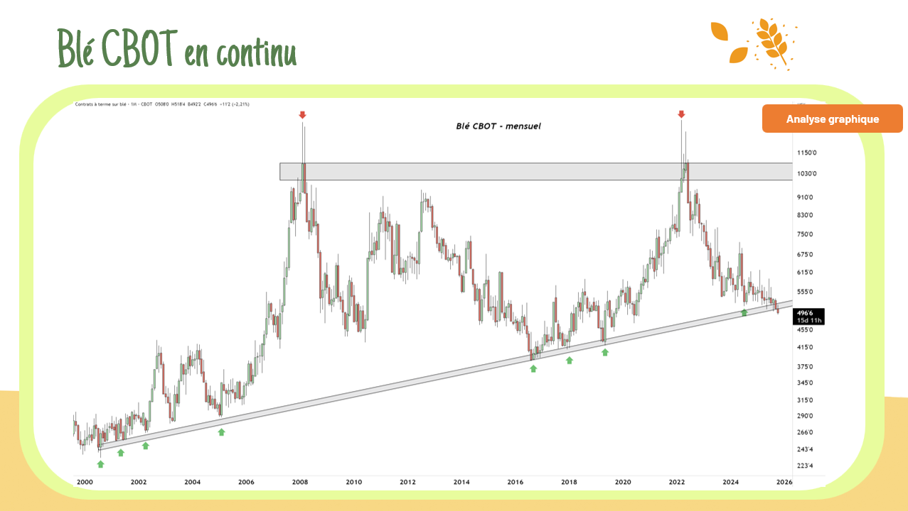 Le blé CBOT tente de casser son support historique de 2001. Les prix atteignent un plus bas depuis août 2020, sans signe de reprise. La baisse de l’€/$ et la compétitivité du blé français soutiennent Euronext, qui diverge du CBOT.