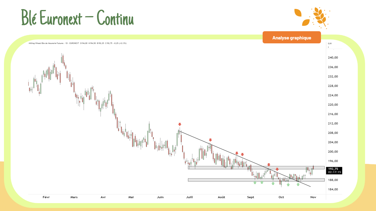 Les cours du blé sur Euronext reviennent tester la résistance horizontale des 194 €/T. Une cassure franche de ce seuil constituerait un signal technique clé, susceptible d’acter la mise en place d’une nouvelle tendance haussière.