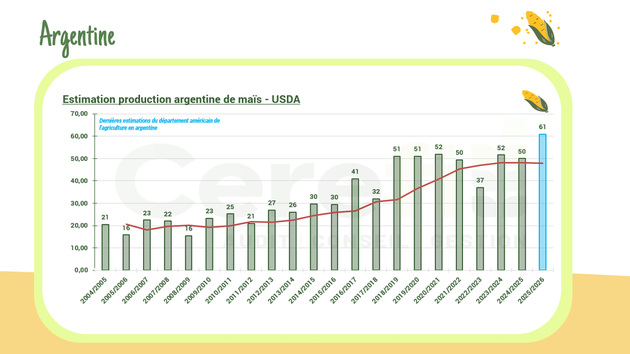 En Argentine, un rapport de l’agence locale de l’USDA en argentine anticipe une production de maïs pour la campagne R25 à 61 MT, contre 52 MT dans les précédentes estimations. Cette révision s’explique principalement par une surface semée plus importante que prévu.