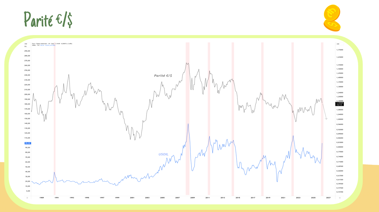 Historiquement, la hausse du pétrole pèse sur l’euro face au dollar. Le billet vert joue son rôle de valeur refuge dans ces phases. Cette dynamique devrait soutenir les cours agricoles européens cette année.