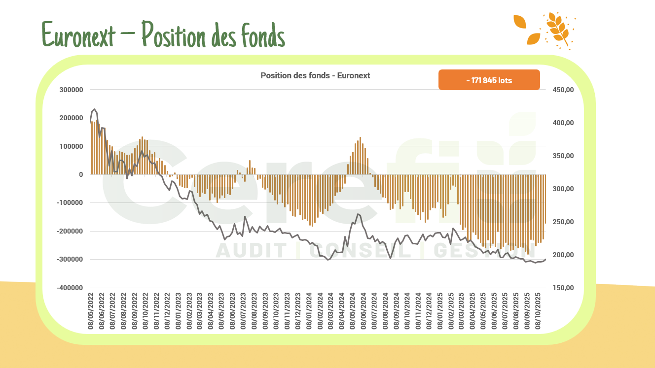 La position nette des fonds en blé est passée de -228 169 à -171 945 lots, un niveau inédit depuis le mois de mars. Cette amélioration traduit un certain regain de confiance et a contribué au redressement des prix. Il reste désormais à voir si cette dynamique se poursuivra dans les prochaines semaines.